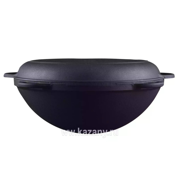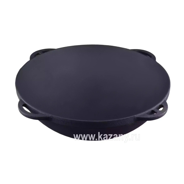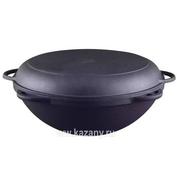 Казан с круглым дном и крышка-сковорода изготовлены из закаленного чугуна без покрытия, прошедшего специальную термическую обработку. Казан имеет четыре литые ручки, крышка – две. Толщина станок – 4 мм. Такая толстостенная конструкция позволяет медленно томить любые блюда без риска пригорания. Идеальный вариант для приготовления узбекского плова.