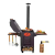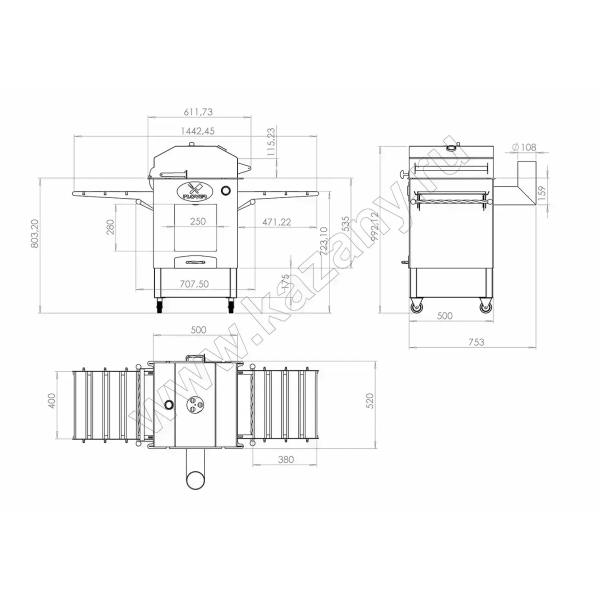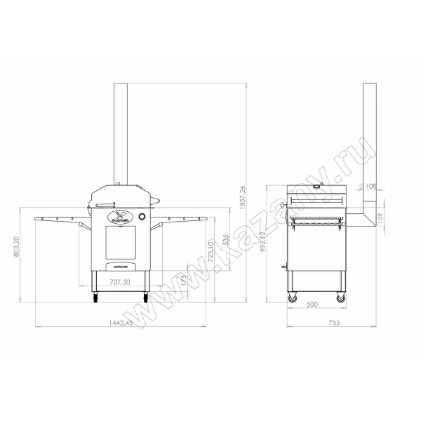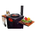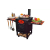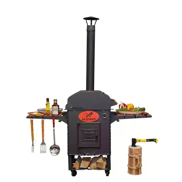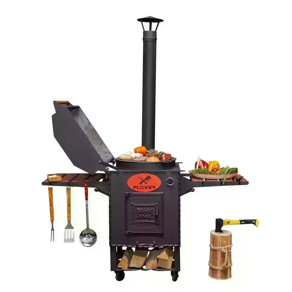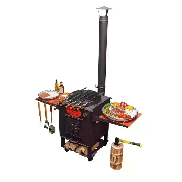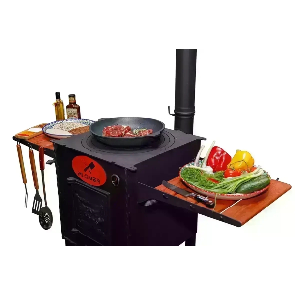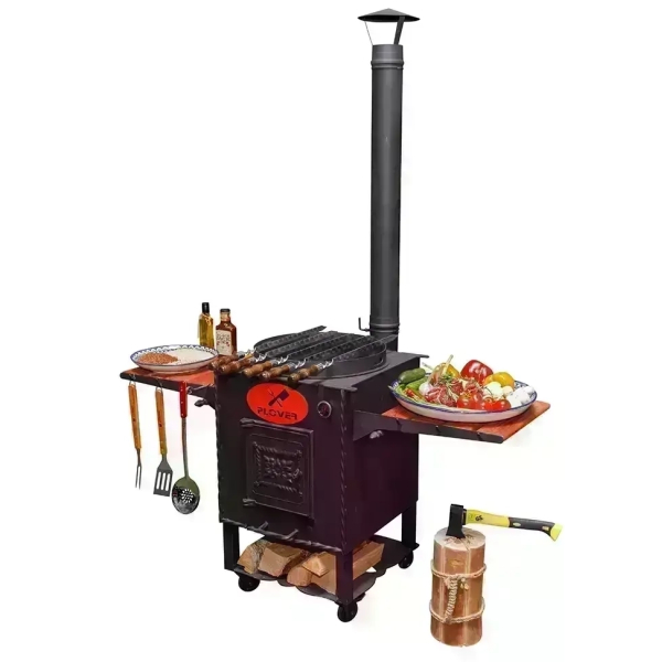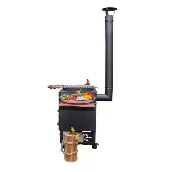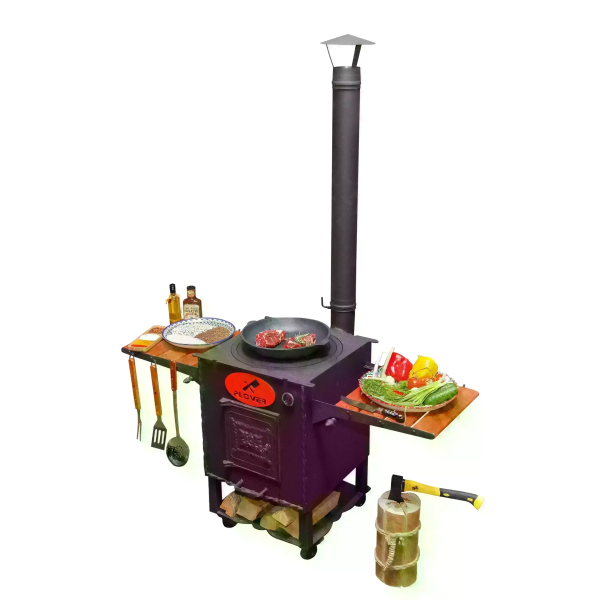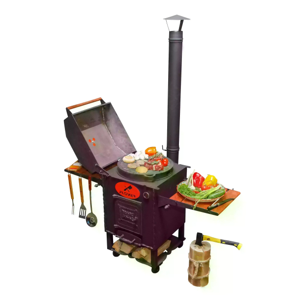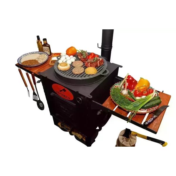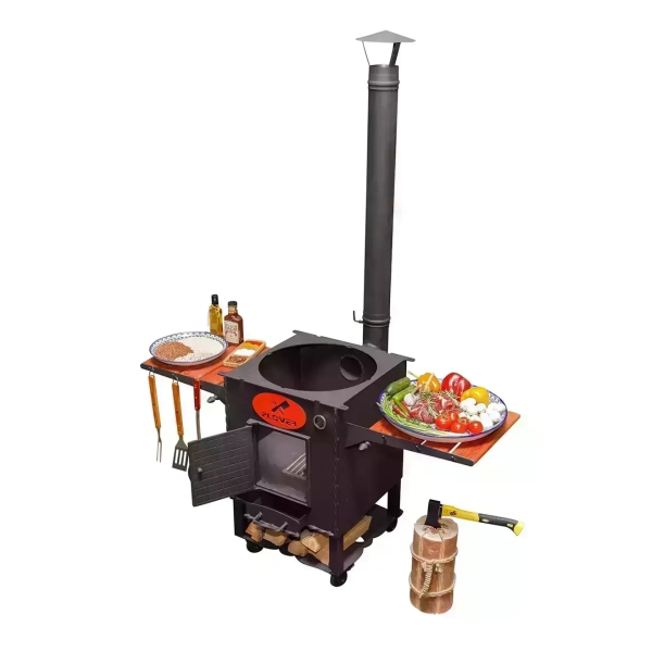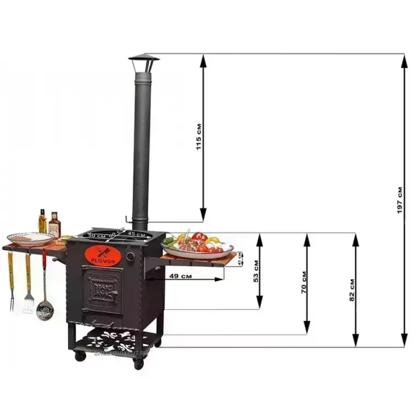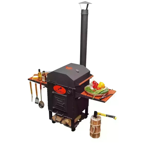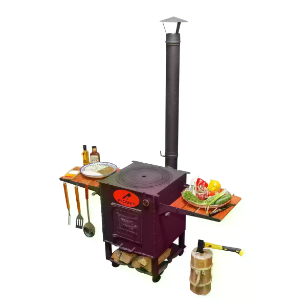 Очаг оснащен боковыми столиками, на которых можно разместить продукты, кухонную утварь, топливо. Поставляется вместе с дымоходом, через который быстро удаляется весь дым. Также очаг оснащен зольником, топкой, дверкой.
