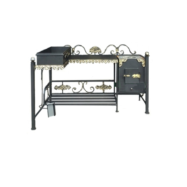 Комплекс включает в себя жаровню и печку. Между ними удобно расположился рабочий столик. Печка и жаровня устанавливаются на специальные постаменты. Несущий каркас оборудован решетчатой полкой для хранения топлива.
