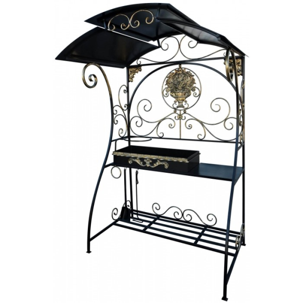 Мангал с крышей “Абсолют” – надежная конструкция с металлической крышей, привлекательными декоративными орнаментами, вместительной металлической полкой для хранения дров или угля. Отличается небольшими размерами, поэтому отлично подойдет для небольшого придомового участка.