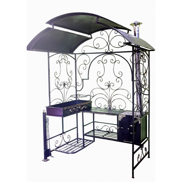 Жаровня изготовлена из термостойкой стали 3-6 мм (можно выбрать на личное усмотрение), днище укреплено колосником. Разделочный столик можно использовать в качестве барной стойки.