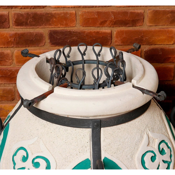 Жаровня укомплектована 12 шампурами, подставкой под крышку, аксессуаром для подвешивания шампуров, совком, чугунным колосником, кочергой. В комплекте также имеется подставка под тандыр. Поверхность печи украшена узорами, стенки с толщиной 8 см усилены металлическим кованым каркасом и ручками. В подставках предусмотрены красивые завитки.
