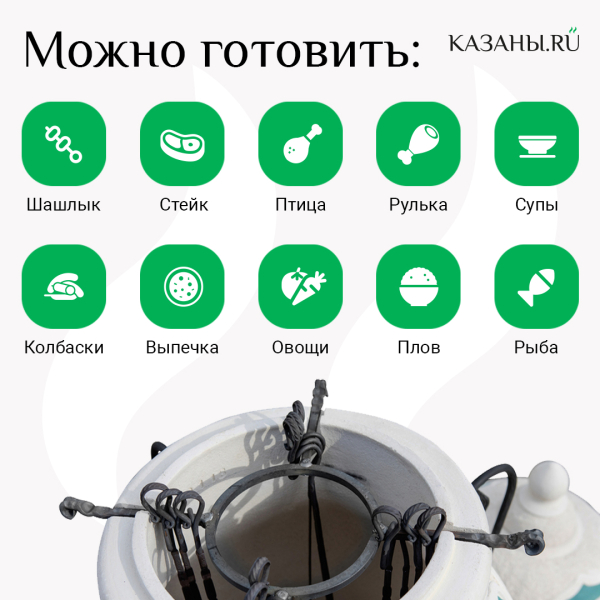 В жаровне можно приготовить разнообразные блюда из птицы, мяса, морепродуктов, теста, овощей. Для этого используются специальные формы, крюки, этажерки, подставки, шампуры. Внушительные по толщине стенки дольше сохраняют жар, когда угли уже погасли. Модель подходит для дома и для коммерческих задач. В такой печи можно приготовить много вкусных блюд.