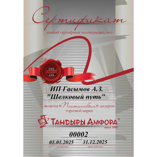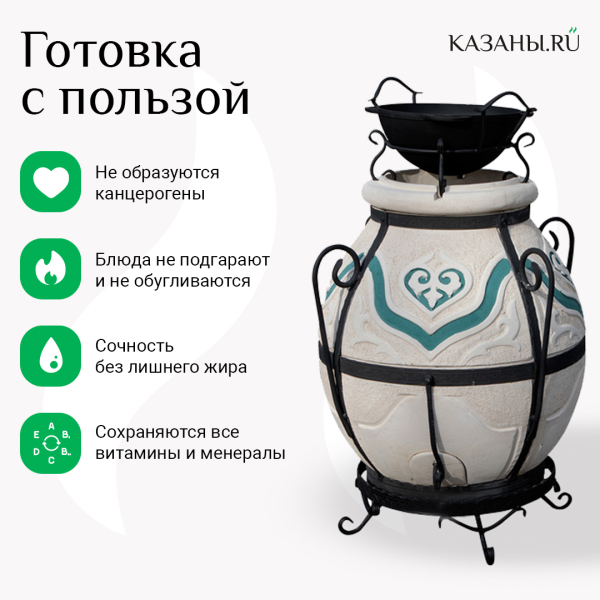 Высота тандыра составляет 113 см, без крышки - 78 см. Диаметр жаровни - 75 см, а диаметр горловины - 31 см. Такая горловина позволяет использовать различные аксессуары больших размеров. Благодаря увеличенной высоте (глубине) печи блюда не подгорают и равномерно обжариваются. Можно не волноваться за равномерность обжарки продуктов, расположенных на этажерке.