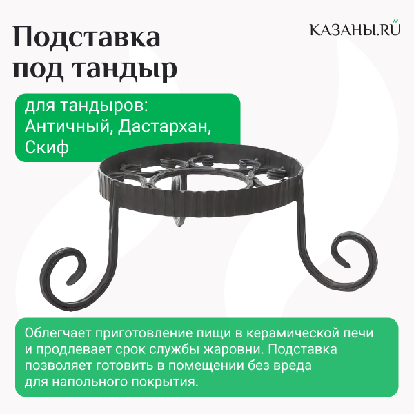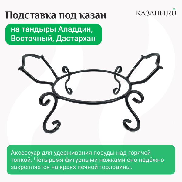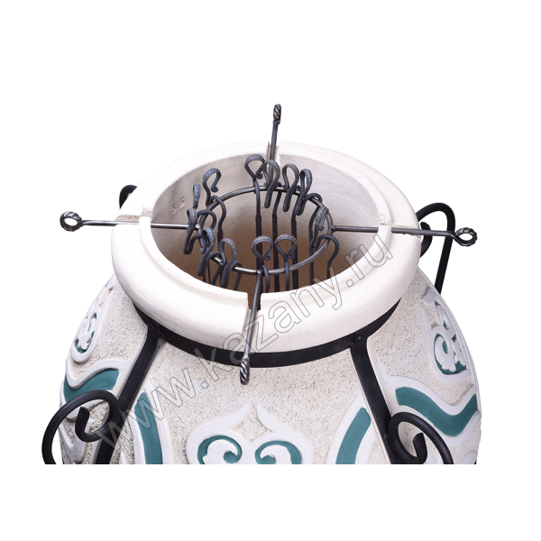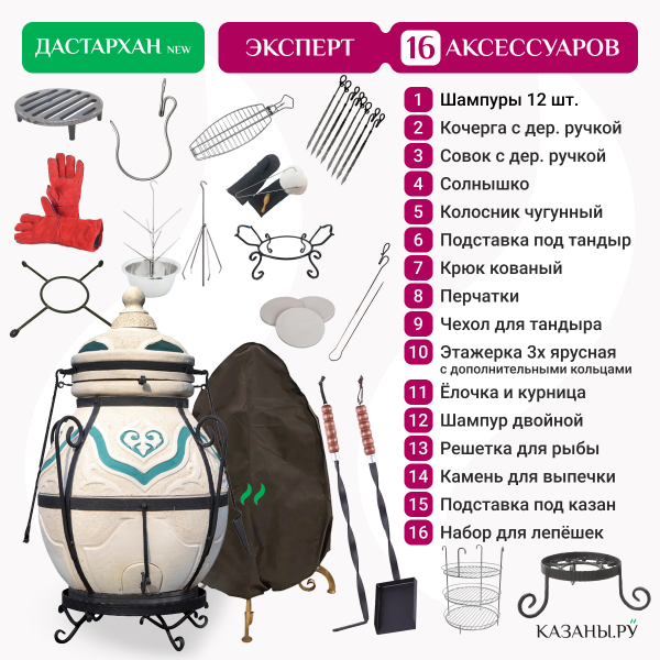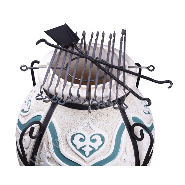 Жаровня укомплектована 12 шампурами, подставкой под крышку, аксессуаром для подвешивания шампуров, совком, чугунным колосником, кочергой. В комплекте также имеется подставка под тандыр. Поверхность печи украшена узорами, стенки с толщиной 8 см усилены металлическим кованым каркасом и ручками. В подставках предусмотрены красивые завитки.