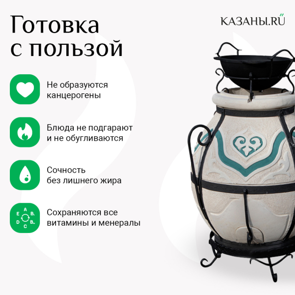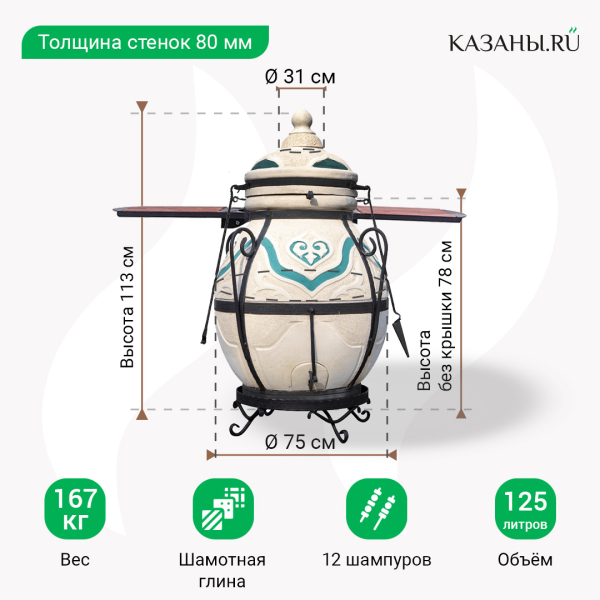 Высота тандыра составляет 113 см, без крышки - 78 см. Диаметр жаровни - 75 см, а диаметр горловины - 31 см. Такая горловина позволяет использовать различные аксессуары больших размеров. Благодаря увеличенной высоте (глубине) печи блюда не подгорают и равномерно обжариваются. Можно не волноваться за равномерность обжарки продуктов, расположенных на этажерке.