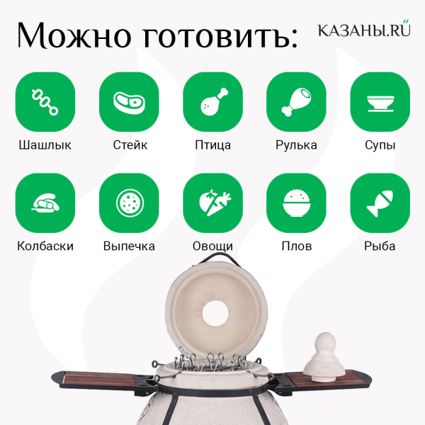 В жаровне можно приготовить разнообразные блюда из птицы, мяса, морепродуктов, теста, овощей. Для этого используются специальные формы, крюки, этажерки, подставки, шампуры. Внушительные по толщине стенки дольше сохраняют жар, когда угли уже погасли. Модель подходит для дома и для коммерческих задач. В такой печи можно приготовить много вкусных блюд.