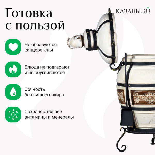 Печь имеет форму бочонка, ее стенки усилены кованым каркасом. Металлические обручи защищают тандыр от механического разрушения. Преимущества очага: