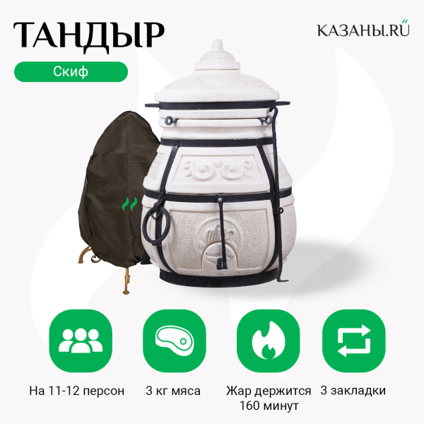 Тандыр "Скиф" - восточная печь средних размеров, изготовлена из экологичной глины. Стенки печи усилены стальным каркасом. На каркасе предусмотрены ручки в виде колец, за которые тандыр можно поднять.