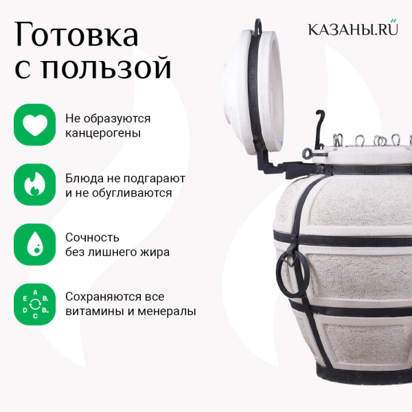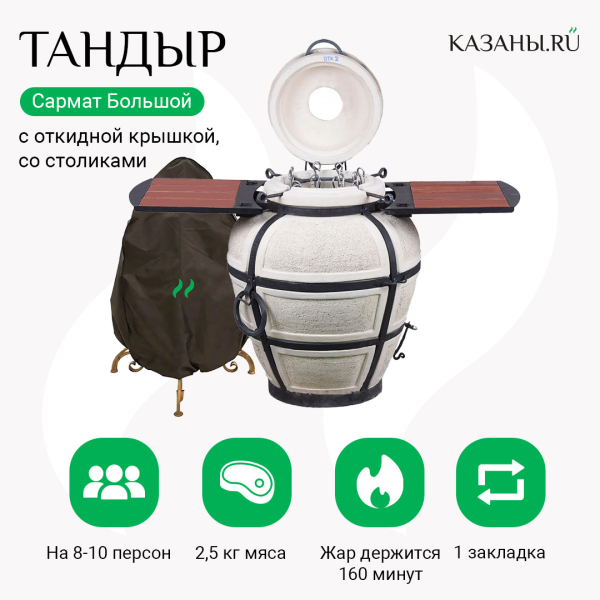 Тандыр изначально - печь кочевых народов, поэтому даже самые большие модели являются мобильными. В них предусмотрены ручки-кольца, чтобы можно было легко поднять конструкцию на телегу. Тандыр всегда имеет стальной каркас, защищающий от механических повреждений, сколов. Сармат "Большой" можно использовать в качестве стационарной печи в частном доме или заведении общепита. А при необходимости его легко перевезти на новое место, взять с собой за город.
