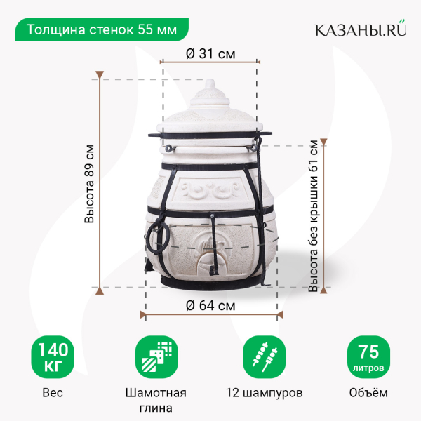 Высота тандыра с крышкой составляет 120 см, без крышки - меньше примерно на 20 см. Диаметр горловины печи - 31 см, общий диаметр - 64 см. Толщина стенок печи - 6 см, это оптимально для камер такого размера. Вес конструкции достигает 125 кг. Вместе с печью в комплекте поставляются 12 шампуров с подставкой для их размещения внутри тандыра, чугунный колосник, кочерга, совок для золы.