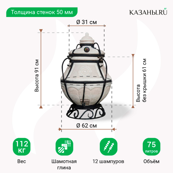 Высота печи с крышкой составляет 91 см, без крышки - 61 см. Диаметр тандыра - 62 см, диаметр его горловины - 31 см. Толщина стенок - 5 см, это оптимальный вариант для модели с такими параметрами. В комплекте с тандыром поставляется 12 шампуров, крестовина, кочерга, совок, чугунный колосник. Шампуры с зажимами отличаются простотой эксплуатации.