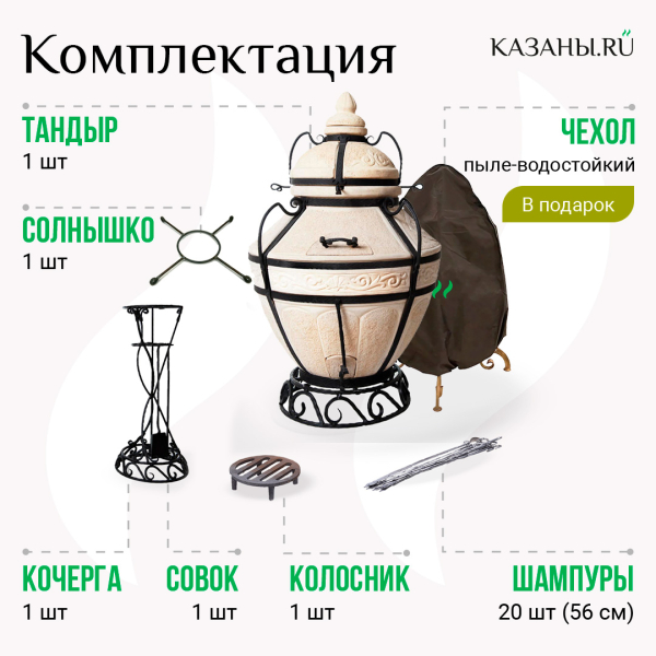 Кочерга, совок, колосник, 20 шампуров, смотровое окно, подставка под тандыр, подставка под крышку и подвешивания шампуров