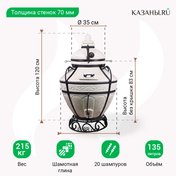 Высота тандыра с крышкой - 120 см, без крышки - 83 см. Диаметр жаровни составляет 83 см, диаметр горловины - 35 см. Толщина стенок очага - 7 см. Печь поставляется с набором из 20 шампуров, подставкой под тандыр и подставкой под крышку, держателем для шампуров, совком, кочергой, чугунным колосником. Поставки и аксессуары имеют элементы ковки, которые служат в качестве дополнительного украшения тандыра. В изделиях выделяются декоративные завитки и узоры.