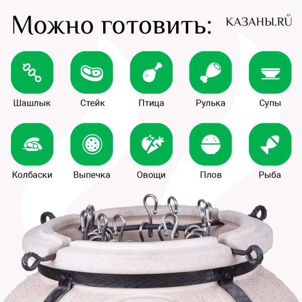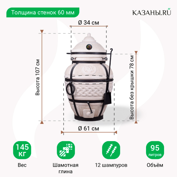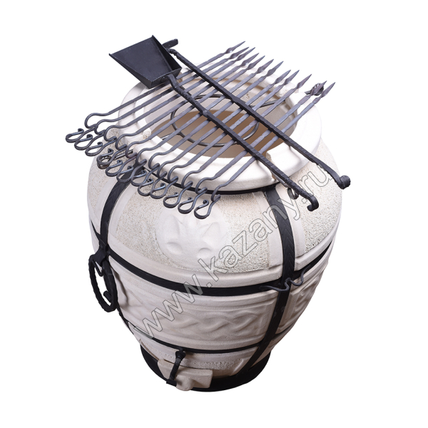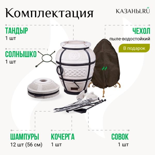 В комплекте с тандыром поставляется 12 шампуров и приспособление для их подвешивания, а также чугунный колосник, подставка, совок и кочерга. При необходимости можно выбрать дополнительные аксессуары для печи, чтобы готовить еще больше вкусной еды. Тандыр подходит для приготовления блюд на природе.