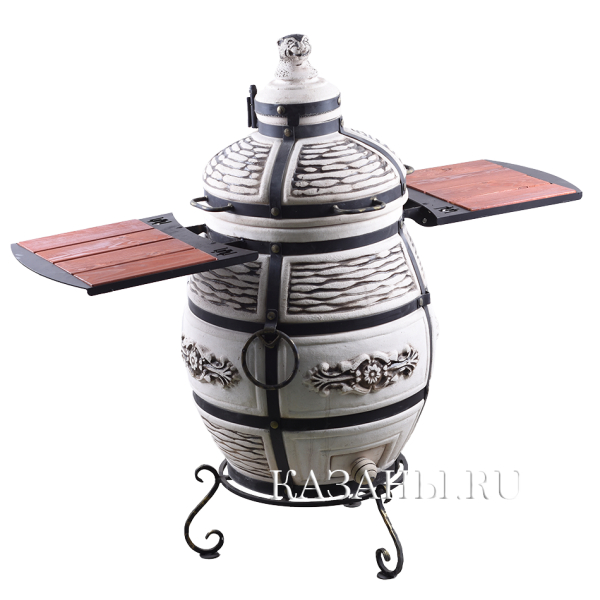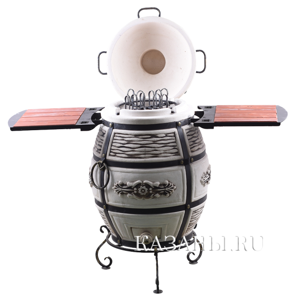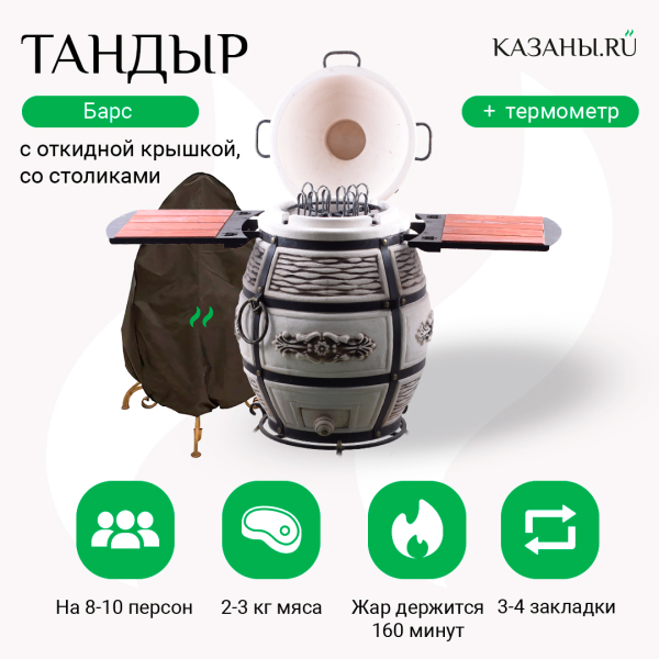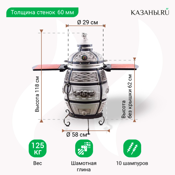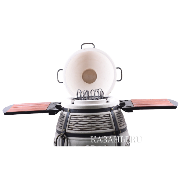 Большой диаметр горловины открывает возможность для выбора различных аксессуаров: 3-ярусных этажерок, елочек, специальных камней. Это увеличивает производительность очага. Увеличенная глубина камеры печи делает его еще более производительным - в тандыре можно приготовить шашлык на больших шампурах. В модели двойная крышка. Чтобы проверить готовность блюда, достаточно поднять самую верхнюю - это значительно легче.