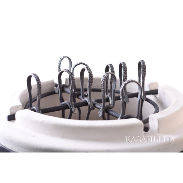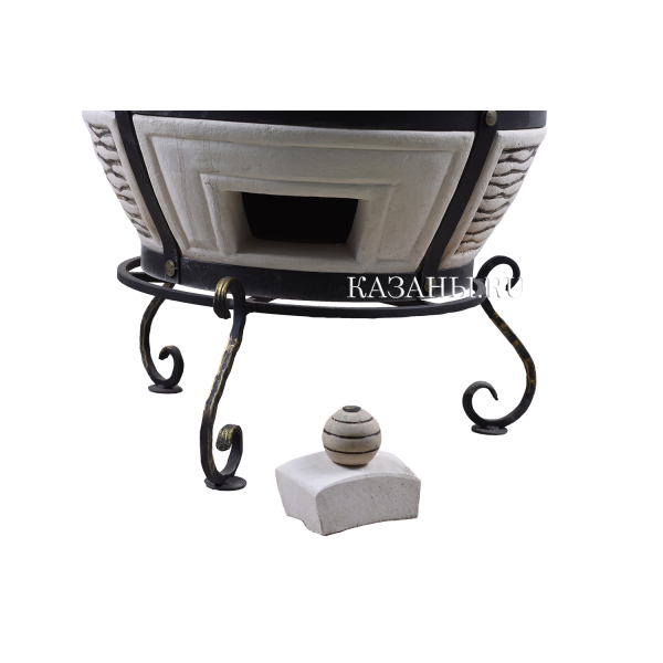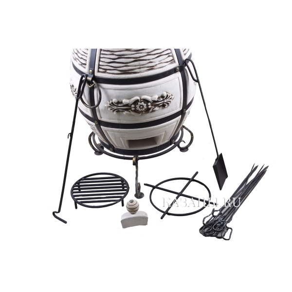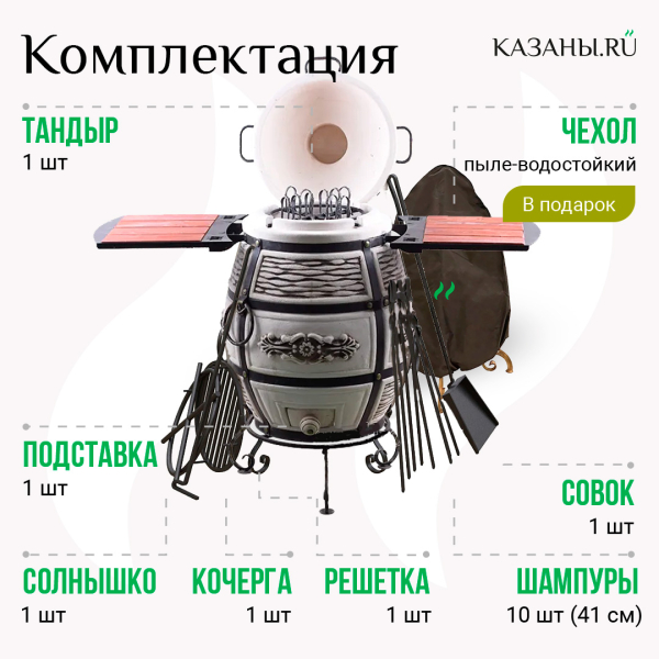 Тандыр поставляется с набором из 10 шампуров, выполненных из нержавеющей стали. Также в комплекте имеется подставка под печь, выполненная методом сварки из кованых элементов. К очагу прилагается чугунный колосник, совок, кочерга.
