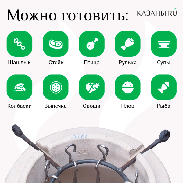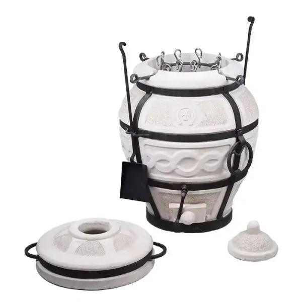 Тандыр предназначен для приготовления разнообразных блюд из птицы, рыбы, мяса, различных морепродуктов, теста. В нем получается изумительная выпечка: пышная, ароматная, мягкая. Конструкция изготовлена из натуральной экологичной глины, которая положительно влияет на свойства продуктов.