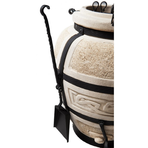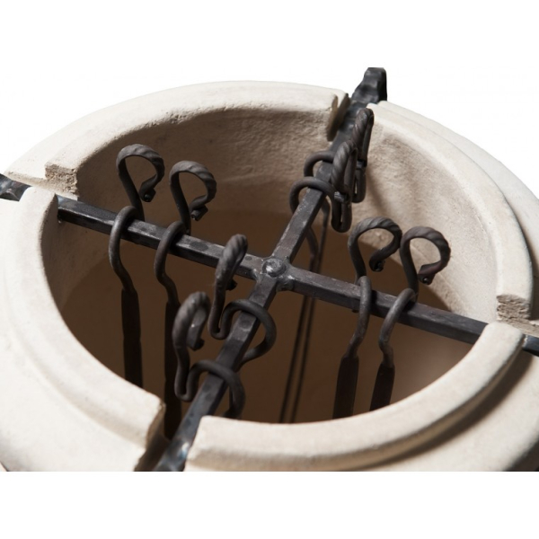 Тандыр Сармат "Есаул" поставляется с кочергой, чугунным колосником, совком, 8 шампурами и приспособлением для их подвешивания. Высота печи с крышкой составляет 89 см, без крышки - 51 см. Диаметр в самой широкой части жаровни - 54 см, диаметр горловины - 29 см. При выборе дополнительных аксессуаров для печи надо ориентироваться на диаметр горловины, если комплектующие должны размещаться внутри глиняной конструкции.