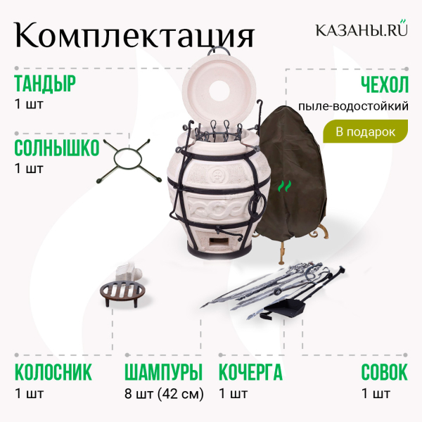 Тандыр Сармат "Есаул" поставляется с кочергой, чугунным колосником, совком, 8 шампурами и приспособлением для их подвешивания. Высота печи с крышкой составляет 89 см, без крышки - 51 см. Диаметр в самой широкой части жаровни - 54 см, диаметр горловины - 29 см. При выборе дополнительных аксессуаров для печи надо ориентироваться на диаметр горловины, если комплектующие должны размещаться внутри глиняной конструкции.