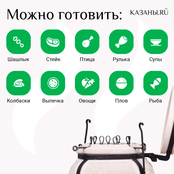 Тандыр предназначен для приготовления разнообразных блюд из птицы, рыбы, мяса, различных морепродуктов, теста. В нем получается изумительная выпечка: пышная, ароматная, мягкая. Конструкция изготовлена из натуральной экологичной глины, которая положительно влияет на свойства продуктов.