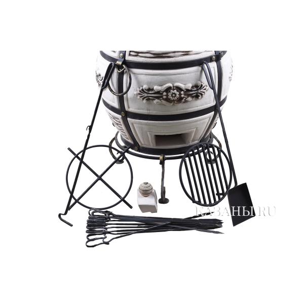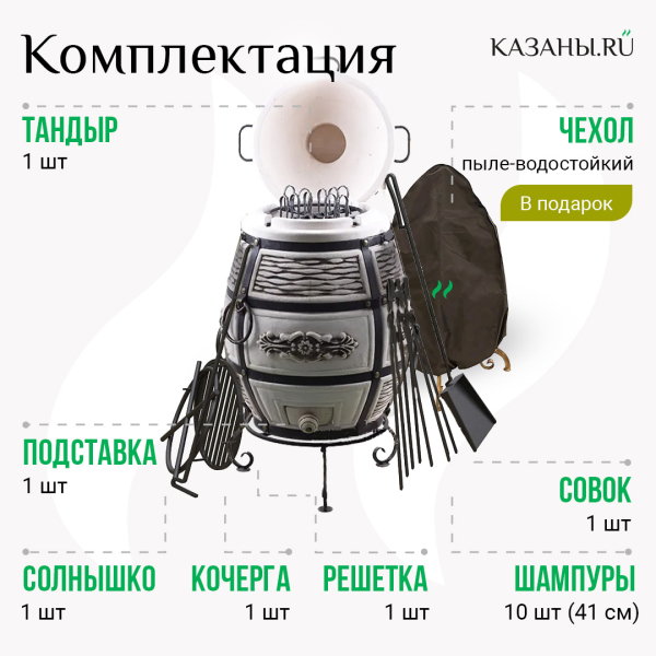 Тандыр поставляется с набором из 10 шампуров, выполненных из нержавеющей стали. Также в комплекте имеется подставка под печь, выполненная методом сварки из кованых элементов. К очагу прилагается чугунный колосник, совок, кочерга.