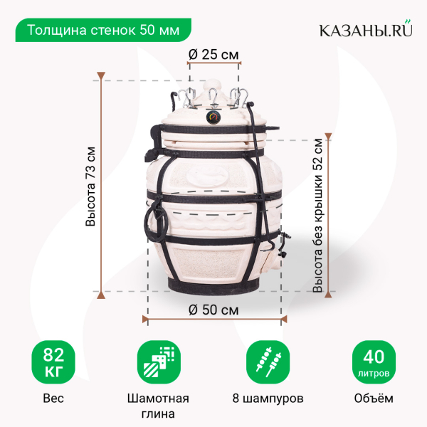 Тандыр "Охотник" - не самый маленький. Его высота с крышкой составляет 76 см, без крышки - 57 см. Диаметр жаровни - 49 см, горловины - 25. При выборе аксессуаров для приготовления блюд надо ориентироваться на диаметр горловины - устройство должно войти внутрь тандыра. Вес конструкции составляет 70 кг. Толщина стенок у печи классическая - 5 см.