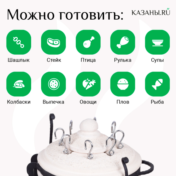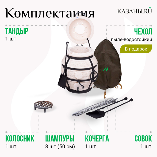 Печь подходит для приготовления мяса, птицы, рыбы и различных морепродуктов, выпечки. В комплекте есть ряд аксессуаров: чугунный колосник, совок, кочерга, 8 шампуров, а также подставка под тандыр. При необходимости можно подобрать другие комплектующие: камни, этажерки, чугунки.