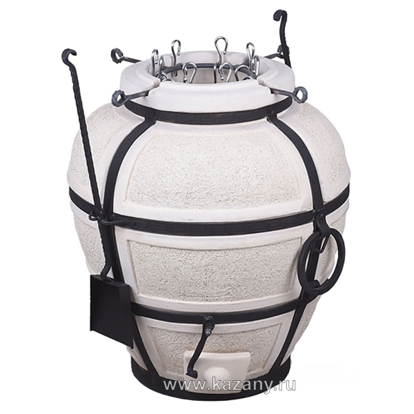 Толщина стенок в большом тандыре составляет 6 см. Высота конструкции с крышкой - 103 см, без крышки - 72 см. Диаметр в самой широкой части жаровни - 59 см, диаметр горловины- 25 см. В комплекте с тандыром поставляется набор из 10 шампуров, приспособление для их подвешивания, совок и кочерга. Комплектующие изготавливаются из металла методом ковки, что придает им дополнительную прочность. Также печь комплектуют подставкой из кованого металла. При желании можно подобрать другие аксессуары для тандыра, чтобы разнообразить количество доступных блюд.