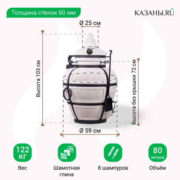 Толщина стенок в большом тандыре составляет 6 см. Высота конструкции с крышкой - 103 см, без крышки - 72 см. Диаметр в самой широкой части жаровни - 59 см, диаметр горловины- 25 см. В комплекте с тандыром поставляется набор из 10 шампуров, приспособление для их подвешивания, совок и кочерга. Комплектующие изготавливаются из металла методом ковки, что придает им дополнительную прочность. Также печь комплектуют подставкой из кованого металла. При желании можно подобрать другие аксессуары для тандыра, чтобы разнообразить количество доступных блюд.